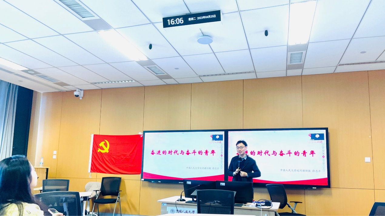 此次主题党日邀请了在2022年4月25日当天和总书记“同上一门思政课”的薛思齐同学进行了主题宣讲。思齐同学以《奋进的时代与奋斗的青年》为主题,和我们聊了聊“作为经历的4·25”。薛思齐同学从人类文明史——人民大学——当代青年人的三个逻辑层次,满怀热情又不失幽默风趣地为我们分享了所见所闻所思所想。强调我们要牢记总书记的殷切嘱托,在奋进的时代争做奋进的青年,用脚步丈量祖国大地,为人民做实事,赓续中国精神的当代传承。
