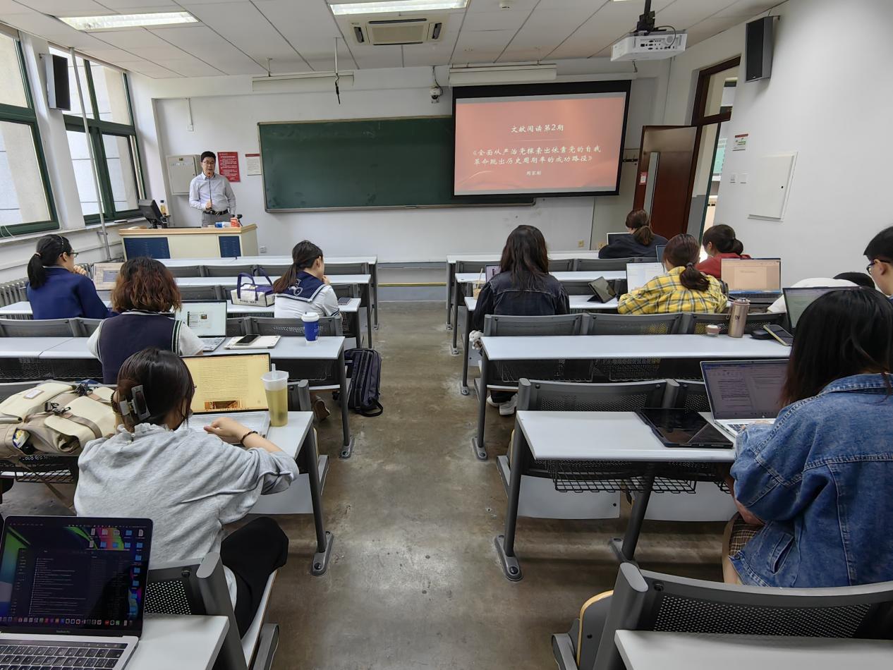 发布日期:2023-05-085月6日中午,金牌影院 本科生专业文献研读课程第二讲在公共教学三楼3202教室举办。本次课程由周家彬副教授主讲《全面从严治党探索出依靠党的自我革命跳出历史周期率的成功路径》文献,学院2020、2021、2022级本科生参加活动。